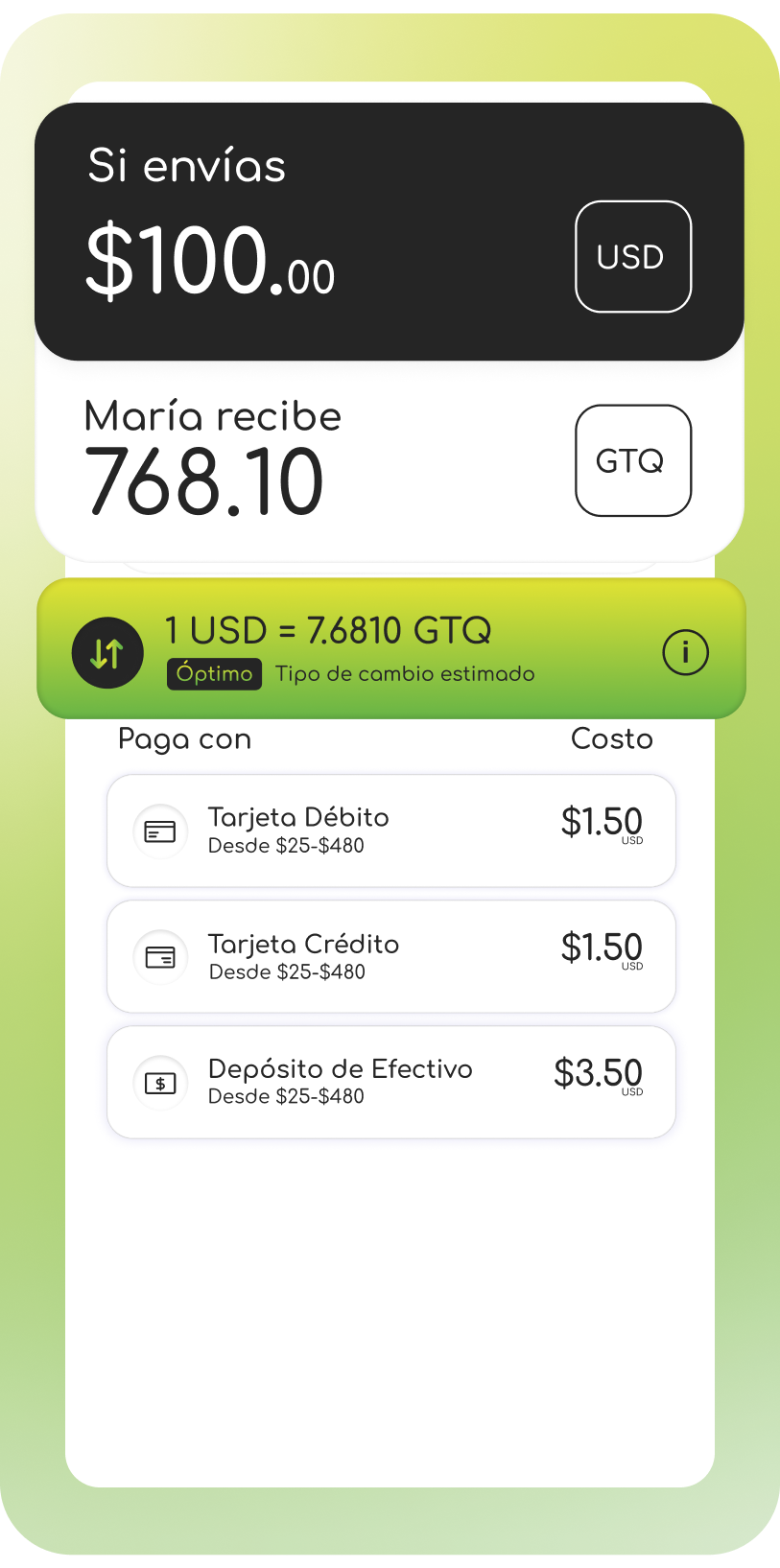 Un tipo de cambio es el precio de la moneda de un país en términos de otra moneda. Te indica la cantidad de una moneda que necesitas para comprar una unidad de otra moneda. Por ejemplo, si el tipo de cambio entre el dólar estadounidense (USD) y el peso (PESO) es 1 USD = 20 PESOS, necesitarías 1 dólar estadounidense para obtener 20 pesos. Utilizamos el tipo de cambio base proporcionado por Mastercard TM o Visa TM. El tipo de cambio proporcionado por nuestros socios es altamente competitivo. Nuestro objetivo es permitirte enviar más "pesos" por tus dólares.