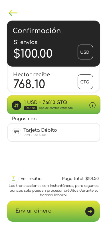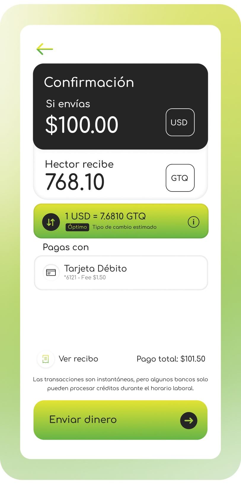 Por ejemplo, los pagos con tarjeta de débito tienen tarifas más bajas que los pagos en efectivo. En todos los casos, cotizaremos tu transferencia y te mostraremos el costo total de la remesa (TCR). Nos esforzamos por mantener los costos más bajos posibles para tu beneficio.